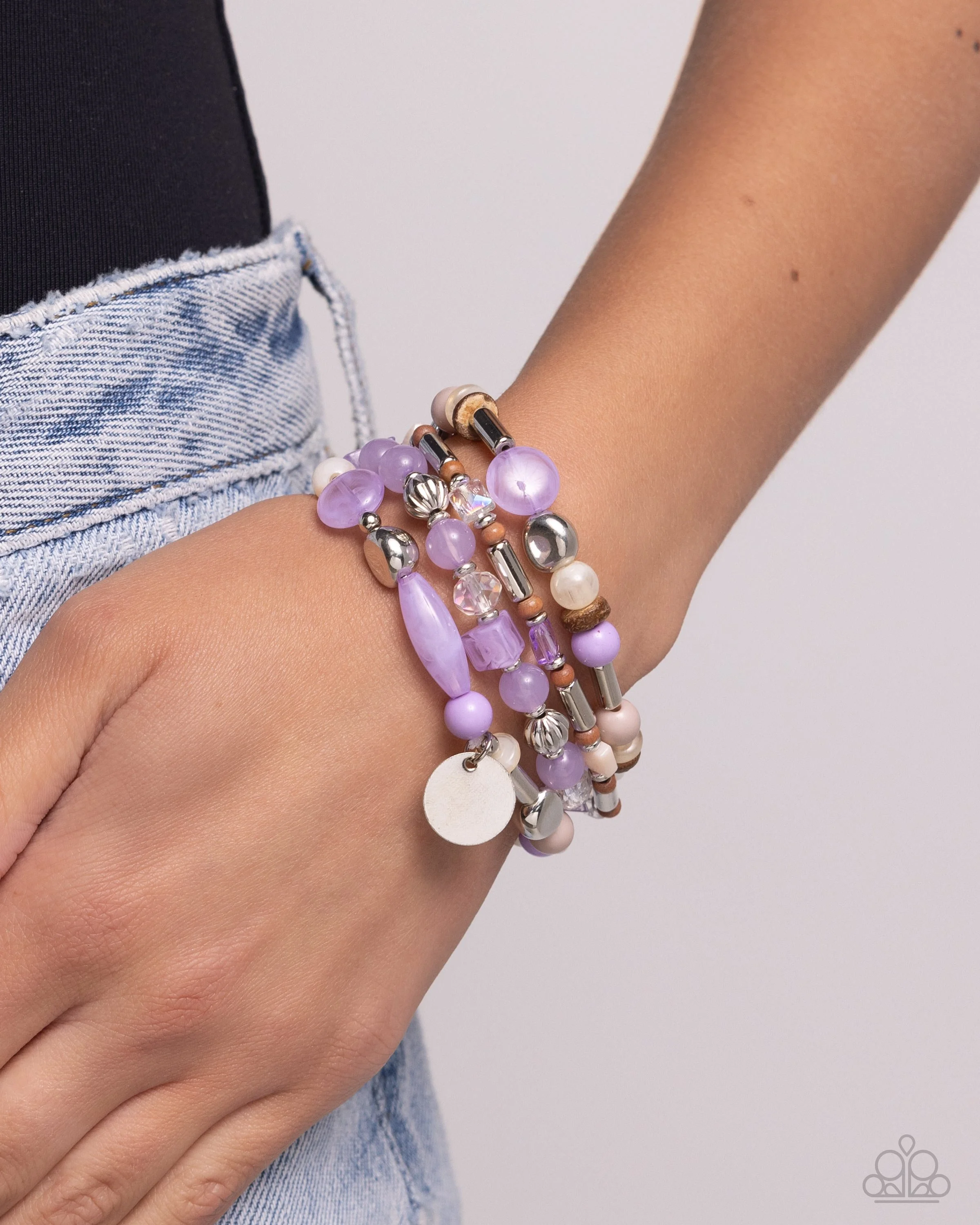 Featuring various opacities, Pastel Lilac, ivory, and Mushroom beads in varying shapes join wooden, iridescent, silver beads, and a silver disc along elastic stretchy bands for a cloudy stack of charm up the wrist. Due to its prismatic palette, color may vary.